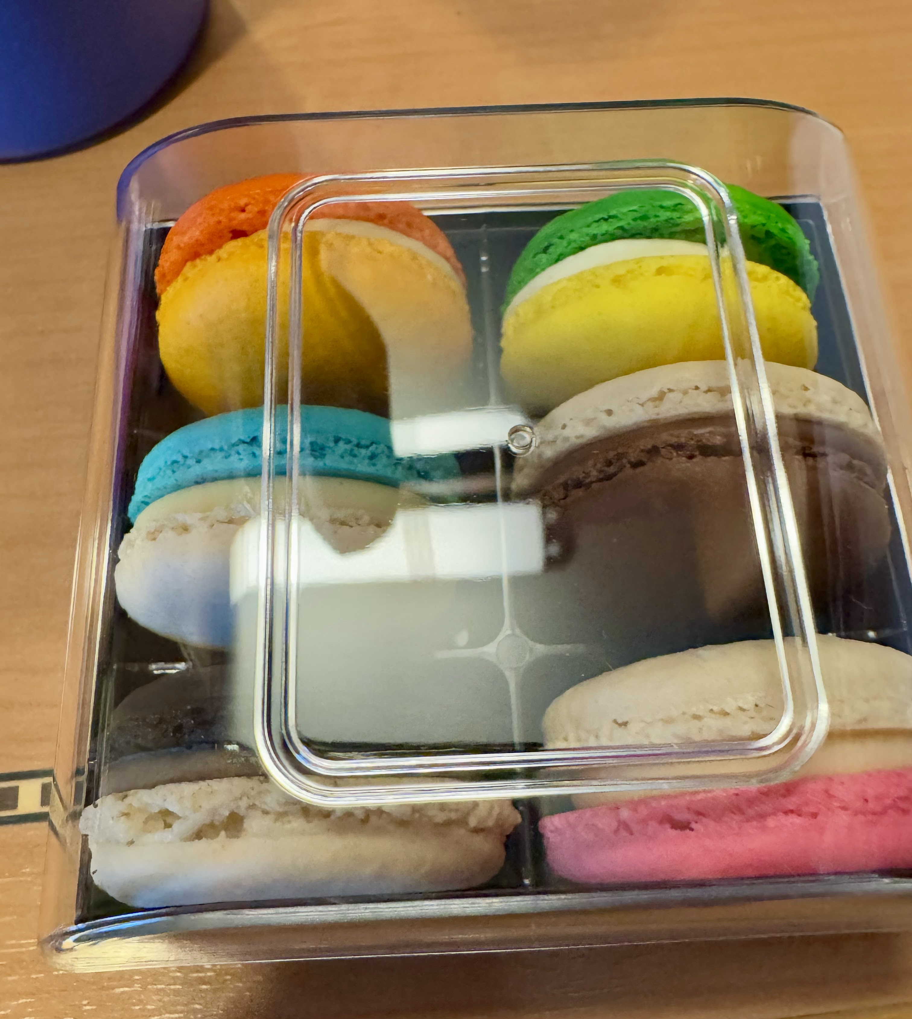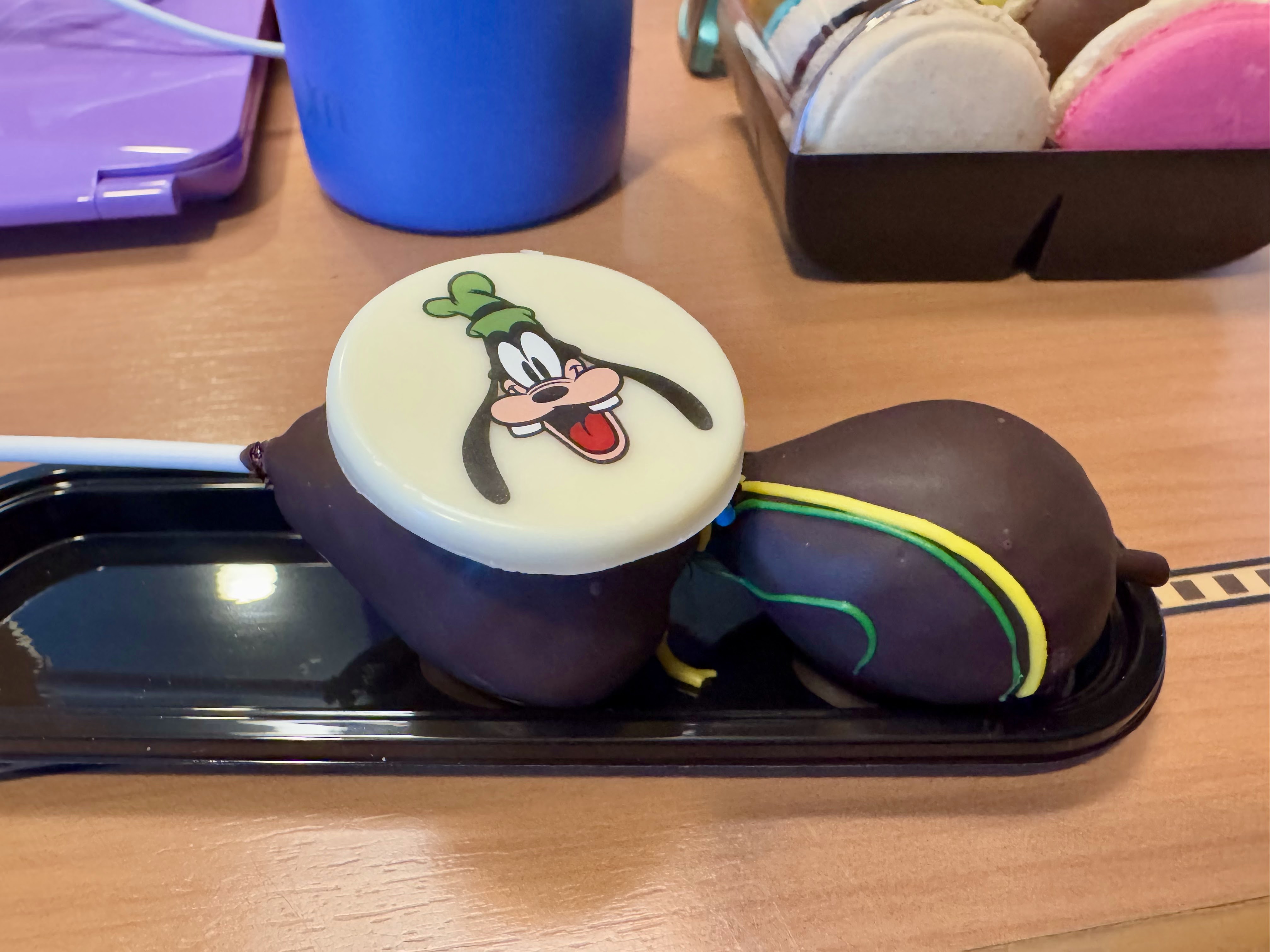 We saw this cool towel animal on the way to Satellite Falls. Looks like a rooster doing yoga. Once we’d relaxed at Satellite Falls for most of the afternoon, we stopped into the sweets shop on board, Sweet On You. We got chocolate covered strawberries, macarons (NOT MACAROONS), and CSP got himself a gorgeous chocolate cupcake.