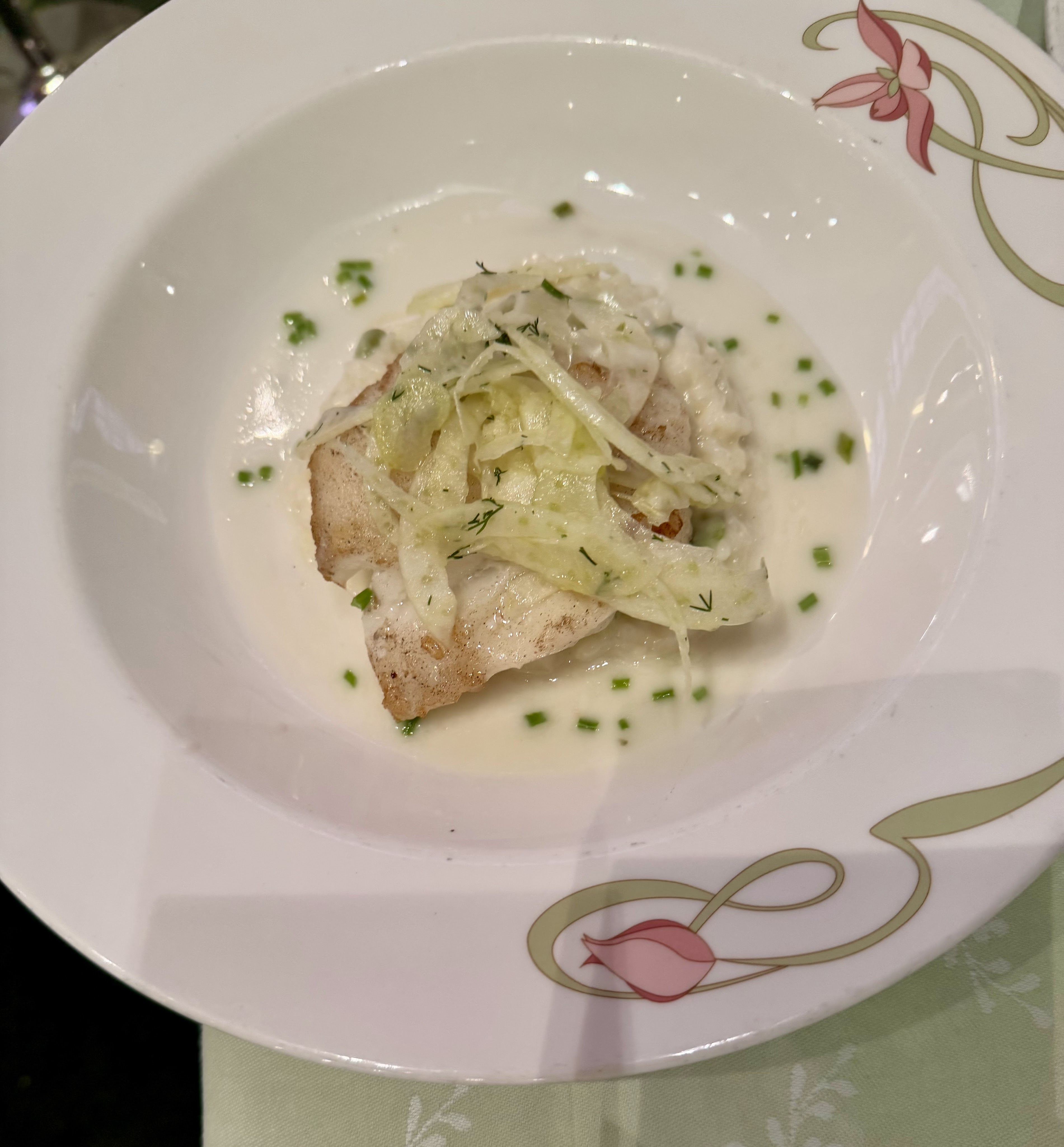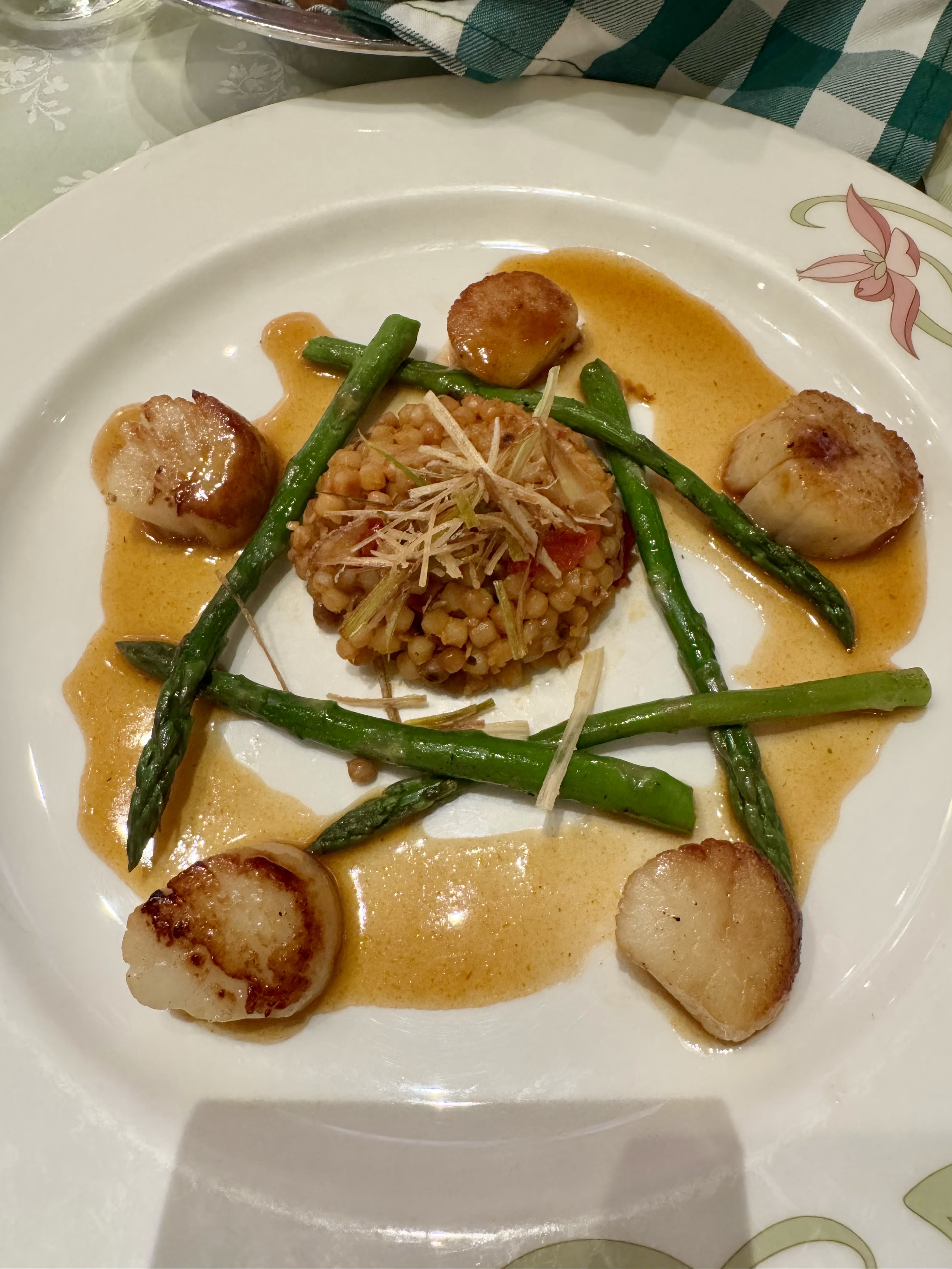 Tonight for dinner, I chose the truffle pursiettes, the roasted chicken, and an apple crumble rice pudding. The chicken came with mashed potatoes and root vegetables. I’m not a fan of that so I asked for a side of CSP’s risotto and Sheldon, our server, was happy to bring it to me. It was delish!