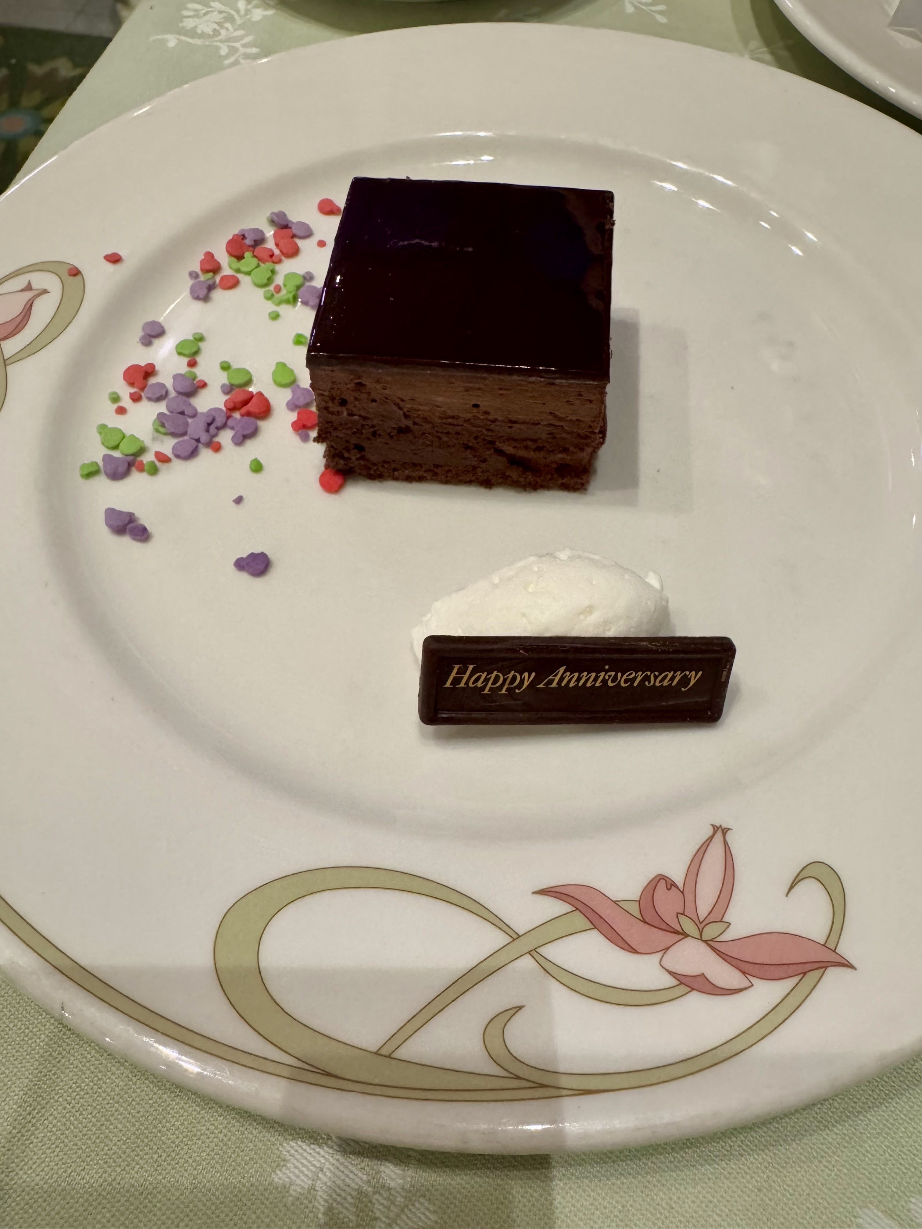 SO yummy!!! On the first night of the cruise, Sheldon, our server, asked us when was our anniversary. I told him March 3. So imagine our surprise when Sheldon arrived at our table tonight bearing an anniversary cake and 4 other servers singing to us! So fun!